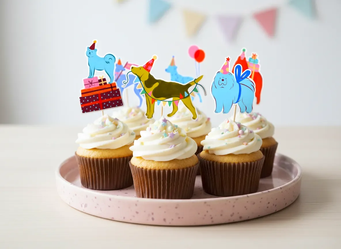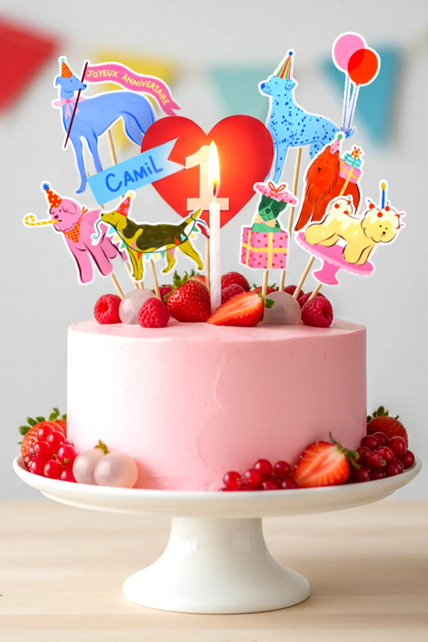 J’ai commencé par dessiner plusieurs petits chiens accompagnés de guirlandes, chapeaux festifs, gâteaux, cadeaux… plein de petits objets rappelant l’anniversaire ! Pour décorer le gâteau, j’ai transformé certains chiens en cake toppers.